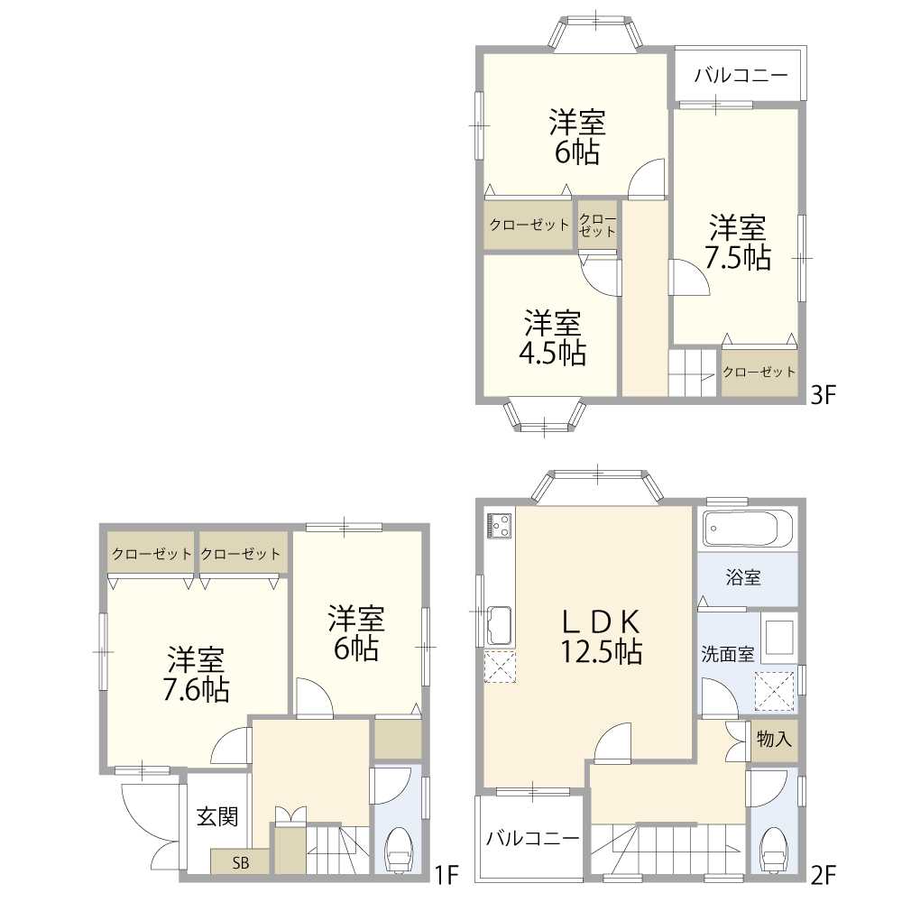 | 間取内容 | 洋室7.6畳 1階 洋室6畳 1階 LDK12.5畳 2階 洋室4.5畳 3階 洋室7.5畳 3階 洋室6畳 3階 | ||